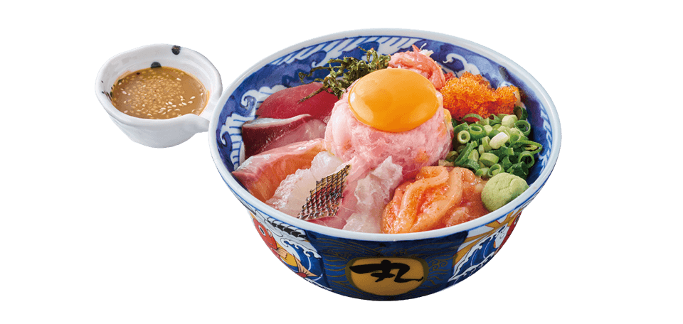 特製ごまだれをかけて海鮮丼、卵黄を割って海鮮卵かけご飯、鯛の魚骨スープをかけて海鮮茶漬けと、一杯で3つの味が楽しめる人気のメニュー。毎日、福岡近郊の市場から届く鮮魚を贅沢に味わえる丼です。