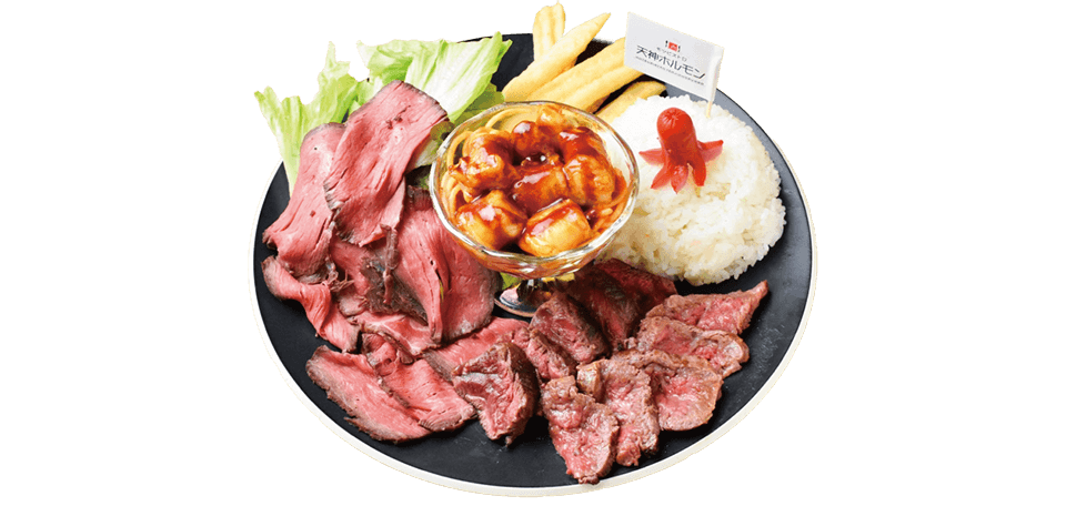 希少部位である、佐賀県産の和牛のウワミスジや国産の丸腸、自家製のローストビーフなど、ひと皿に8種のおかずやごはんをのせた大人用のお子様ランチ。グルメな大人も満足のひと皿です。