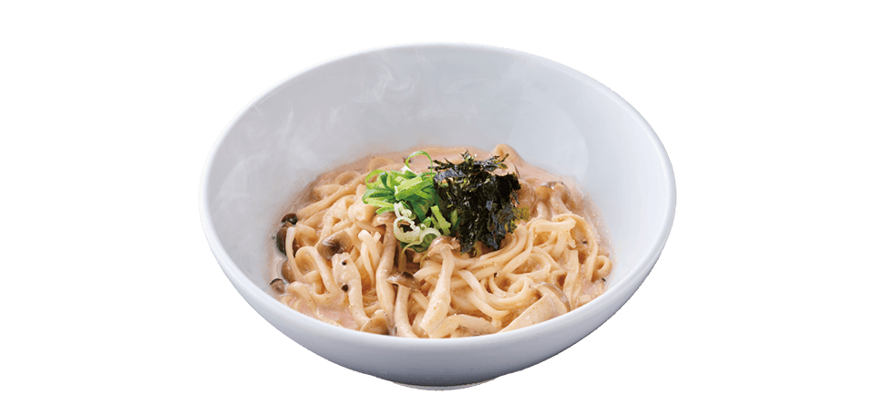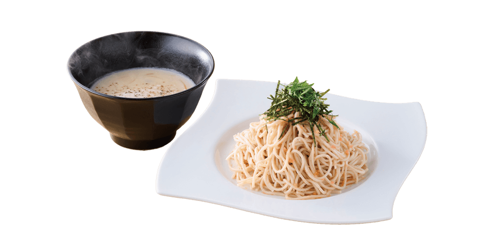 数種の削り節で取ったダシに、ホワイトソースを合わせたクリームのつけダレ。そこにふくやの辛子明太子を大胆に和えた、ピリ辛の日本そばが完成。蕎麦粉の風味は、ミルキーな濃厚ソースにもマッチします。
