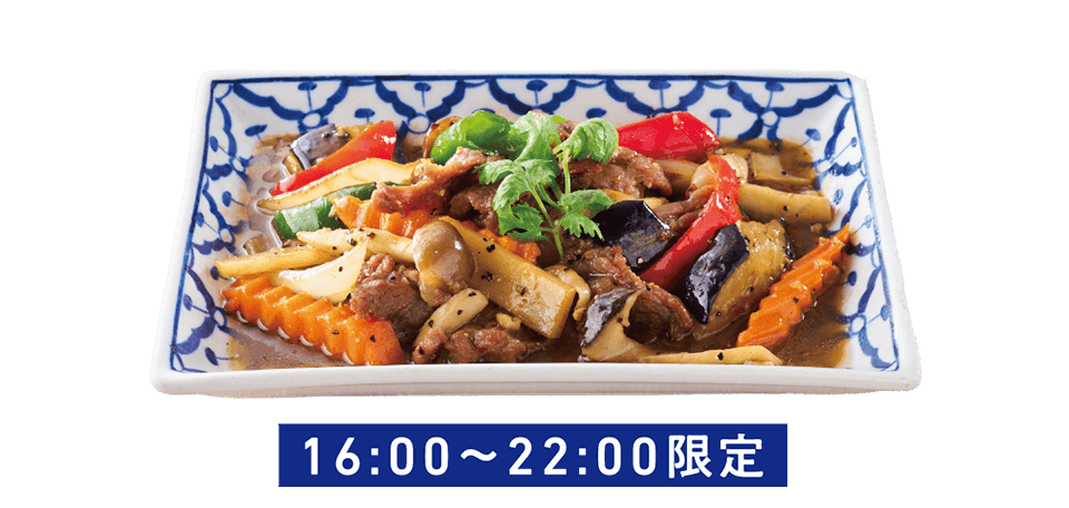 九州産の具材を使ったタイ式の野菜炒め。きのこと彩り野菜、牛ロースをオイスターソースとタイの調味料で味付けした、食欲を掻き立てるスパイシーなひと皿。添えられたパクチーが爽やかなインパクトを残します。