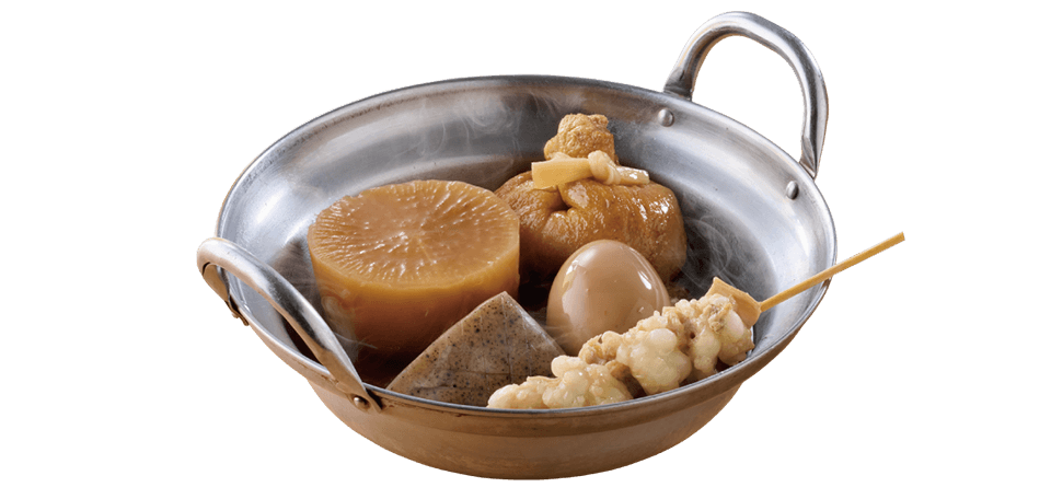 看板メニューの博多ぷりもつ串1本をはじめ、大根、博多煮たまご、もち巾着など、その日おすすめの具材を盛りつけたおでん。ダシには、秘伝のもつ鍋スープを使用し、大きめでぷりっとした食感のもつとよく合います。