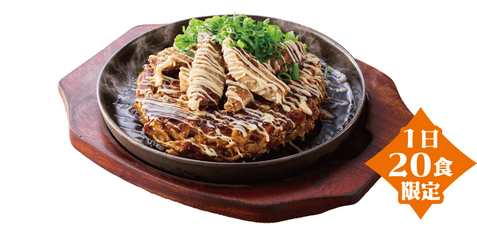 厚めにカットした糸島豚をのせた期間限定のプレミアムお好み焼き!ジューシーな豚肉は、お好みソースにも負けない旨みで存在感を示してくれます。数に限りがあるのでご注意を!
