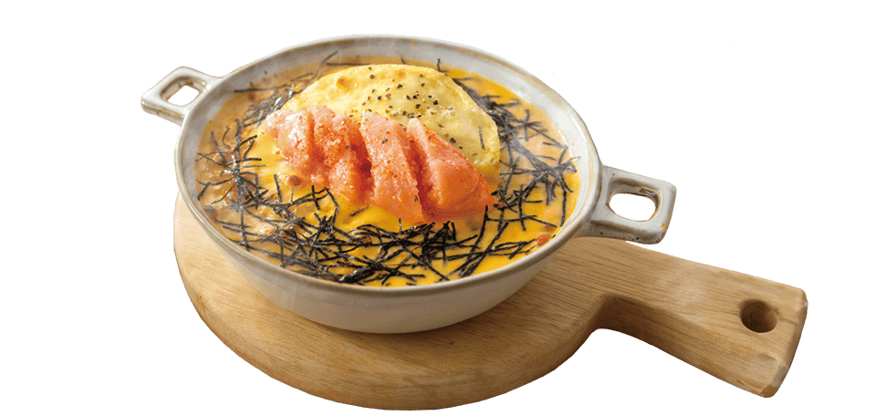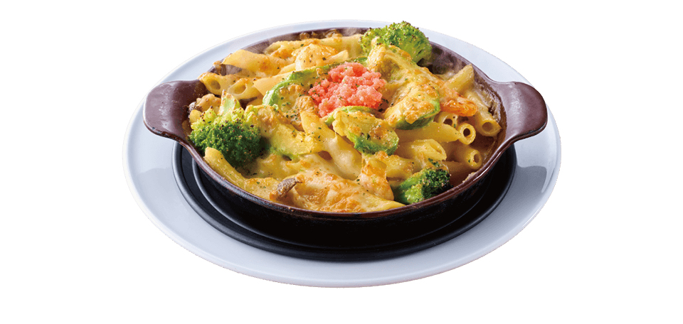 濃厚な明太子クリームのグラタンに、エビやゴロッと大きなかぶ、ブロッコリー、アボカドなど、具材をたっぷり並べて焼き上げました。明太子がアクセントになる食べ応えのあるメニューです。