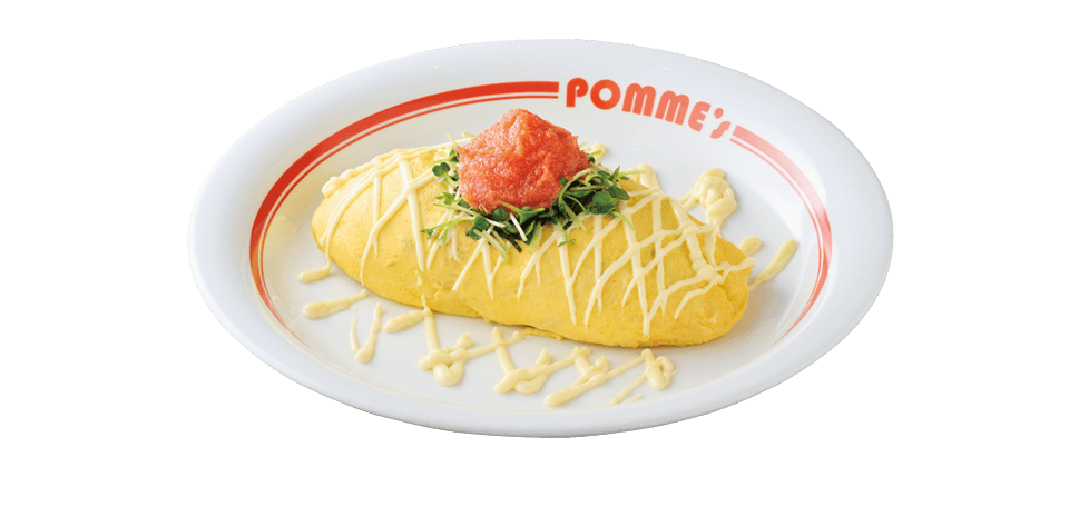 明太子とマヨネーズがトッピングされた人気の高い和風オムライス。たっぷりの明太子とふわとろたまごは、幅広い世代に支持される味わい。ライスは和風ライスとバターライスのどちらかを選べます。